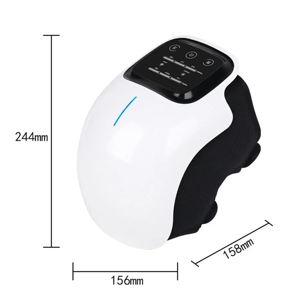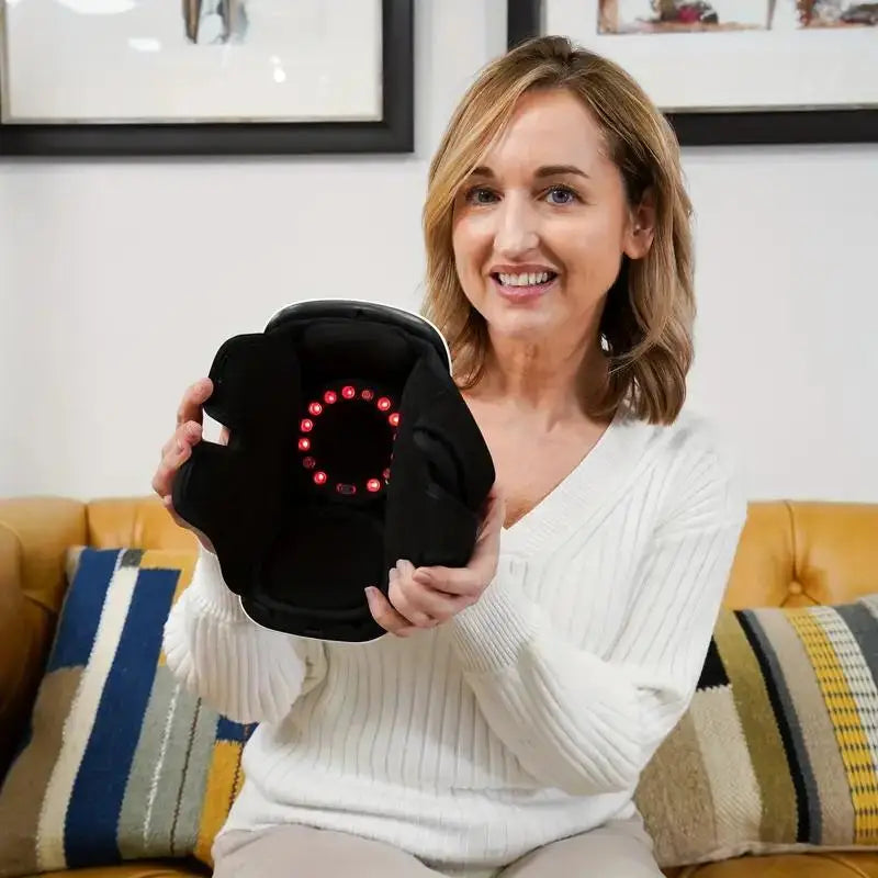 The device uses EMS, vibration, heat, air compression, and red light therapy to relax muscles, reduce swelling, and support the joint.